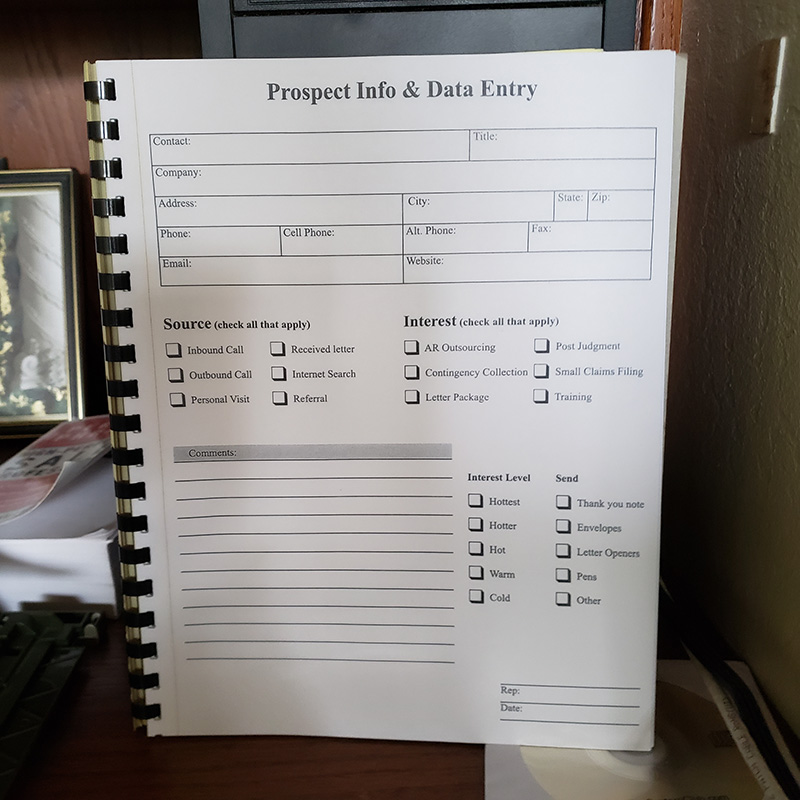 When I’m talking to a prospective customer, I grab it, and at the appropriate time, I ask all the questions and fill it out. One copy goes to the data entry person, and I keep the one in the book, so I always have a printed copy.